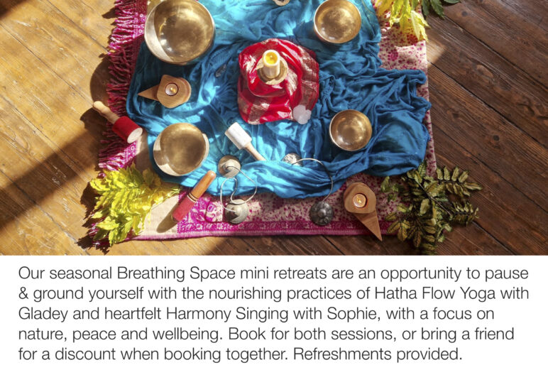 Autumn Breathing Space – Yoga and Harmony Singing half day retreat includes grounding and balancing Hatha Flow Yoga with Gladey Rowan and uplifting and heartfelt Harmony Singing with Sophie Sterckx. Sophie will be teaching some of her own compositions and rounds in overlapping heartwarming harmony.