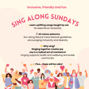 Once a month on a Sunday afternoon I facilitate a singing session. Inclusive and accessible for all. It is a warm and friendly environment and. I provide homemade cake for the tea break! We sing all sorts, depending on whatever has inspired me in my week. I teach by ear and provide lyrics if needed.